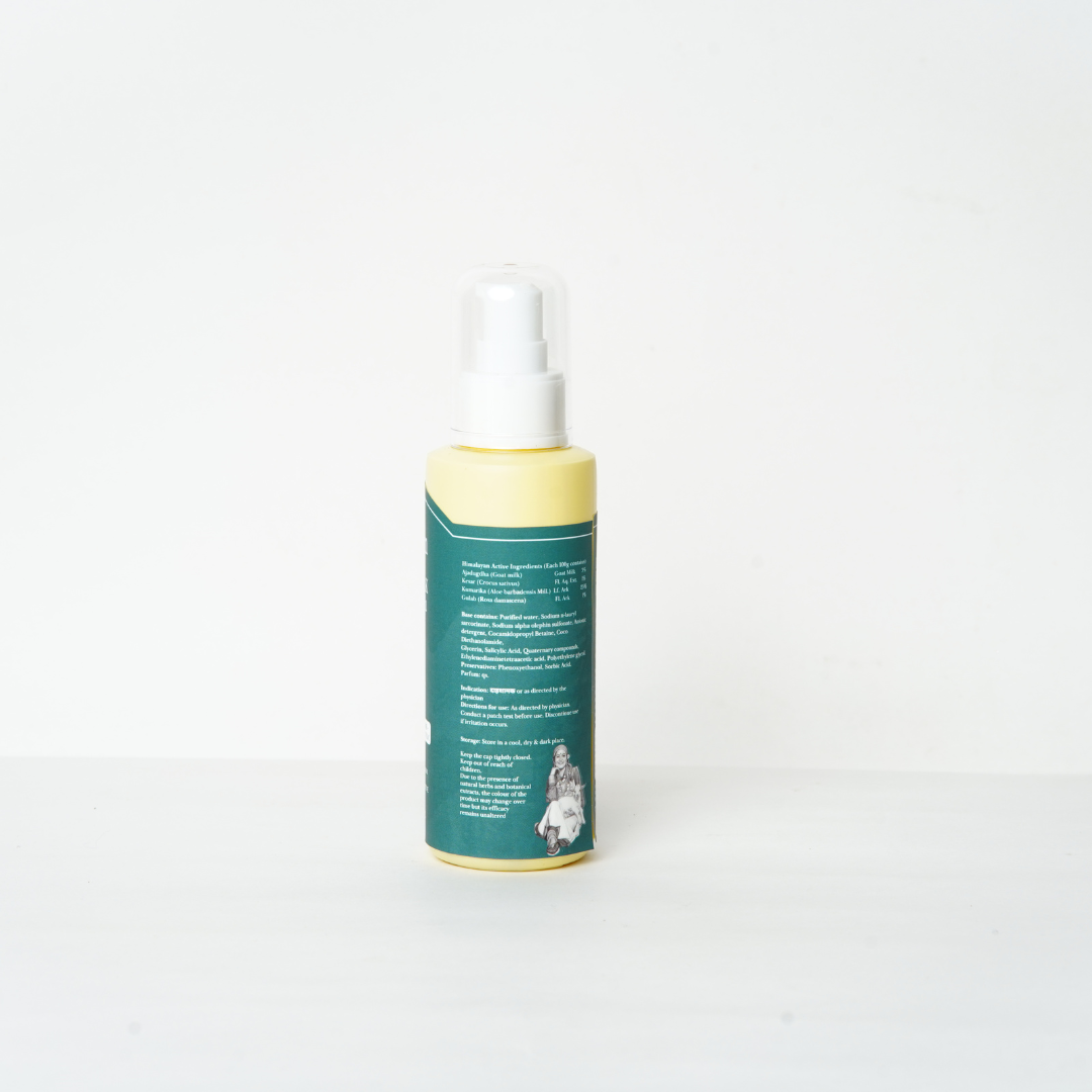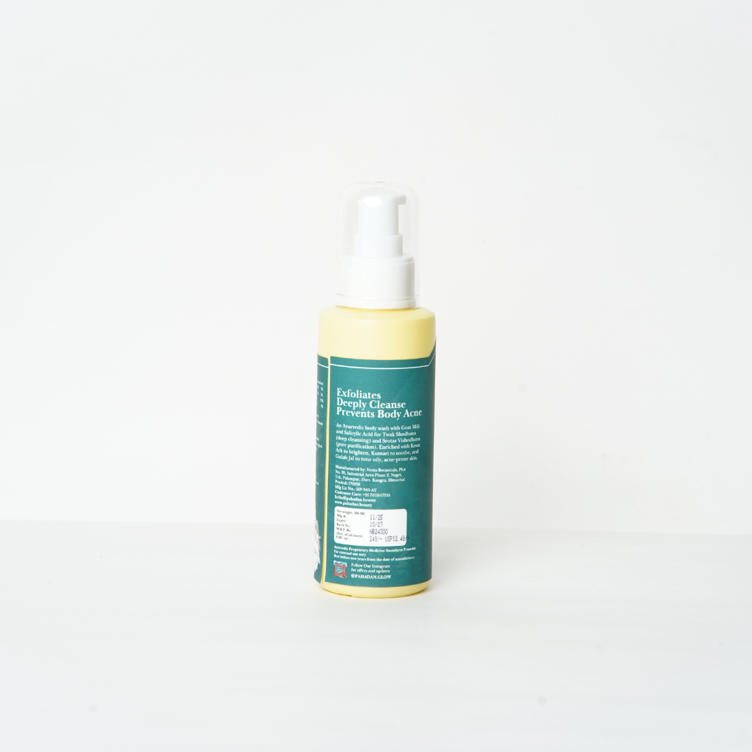 An Ayurvedic body wash with Goat Milk and Salicylic Acid for twak shodhana (deep cleansing) and srotas vishodhana (pore purification). Enriched with Kesar Ark to brighten, Kumari to soothe, and Gulab Jal to tone oily, acne-prone skin.